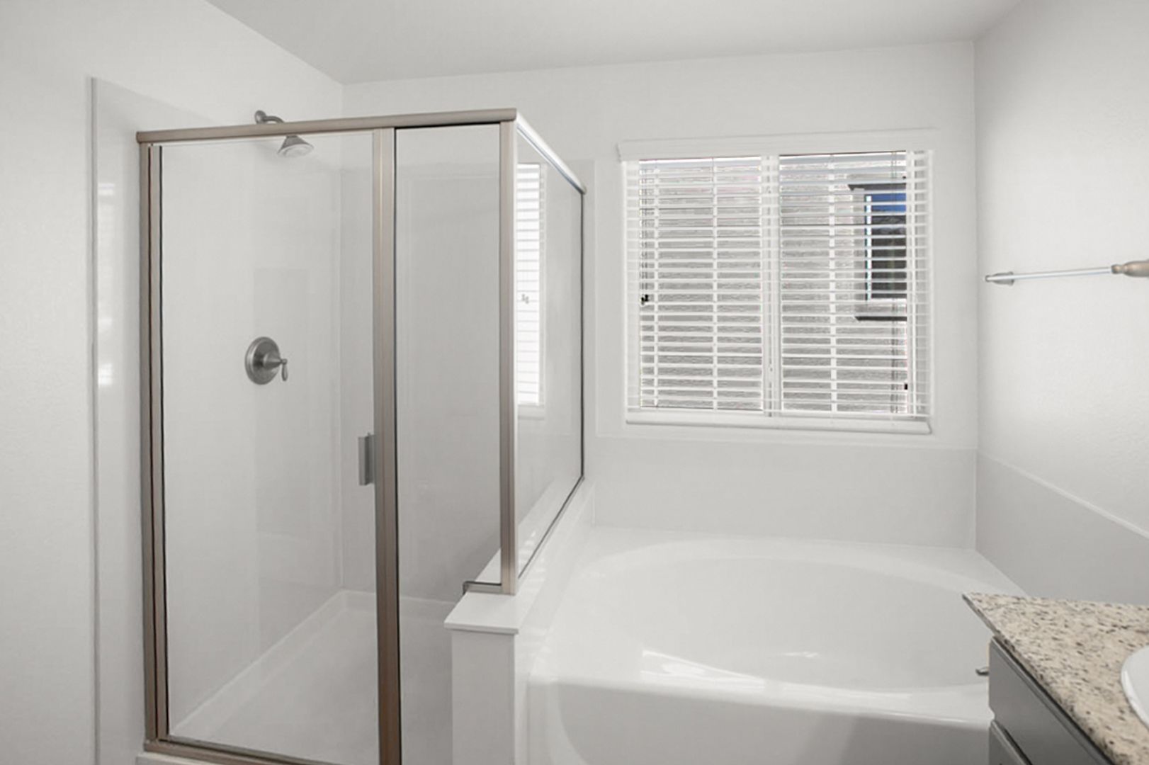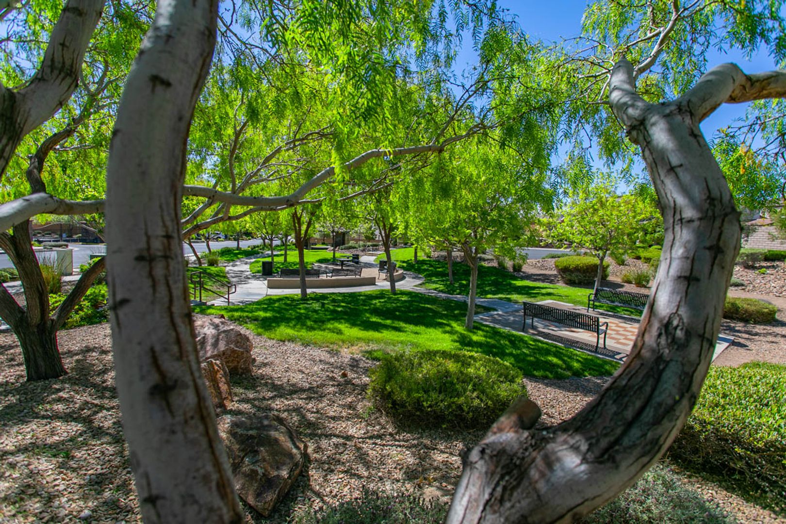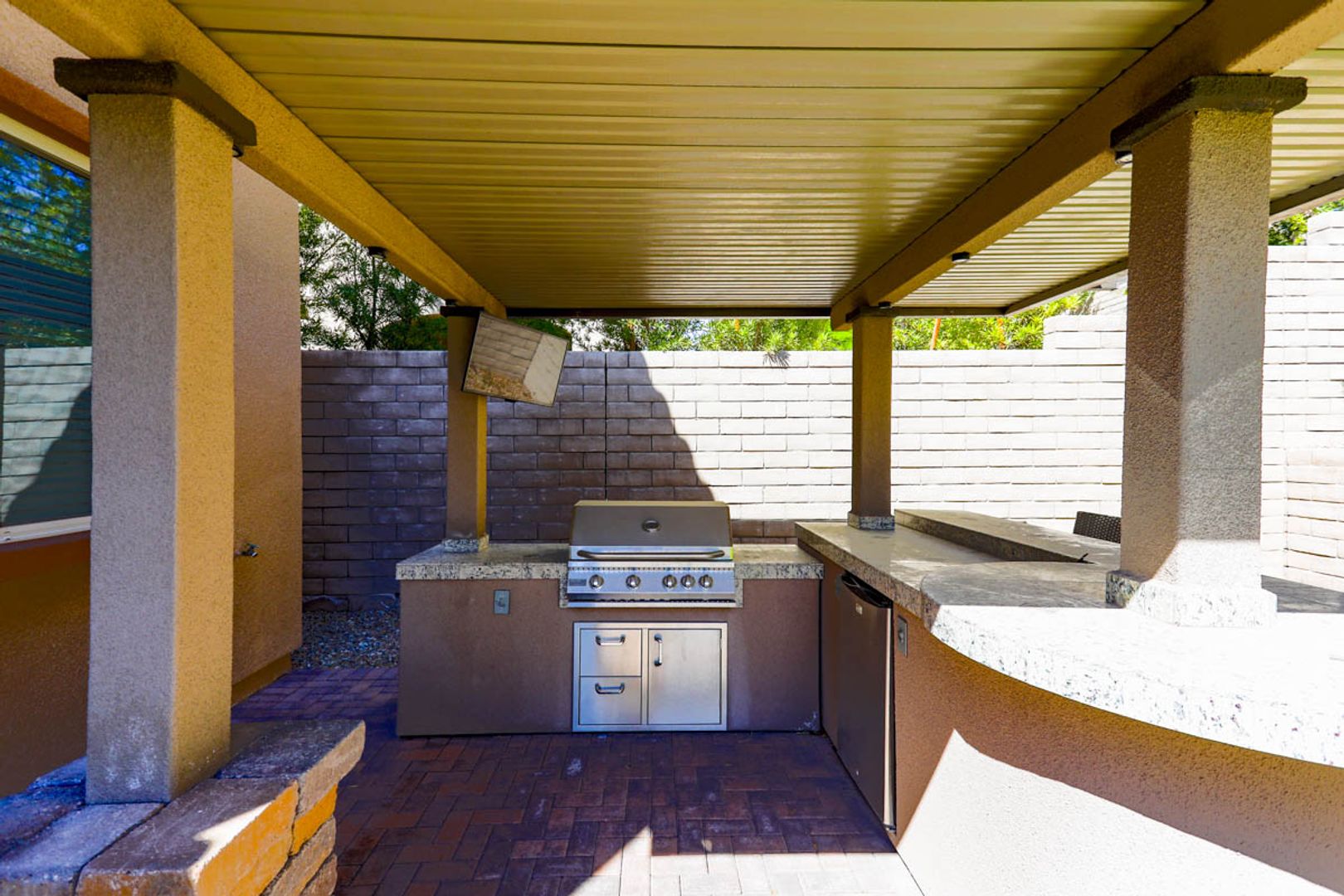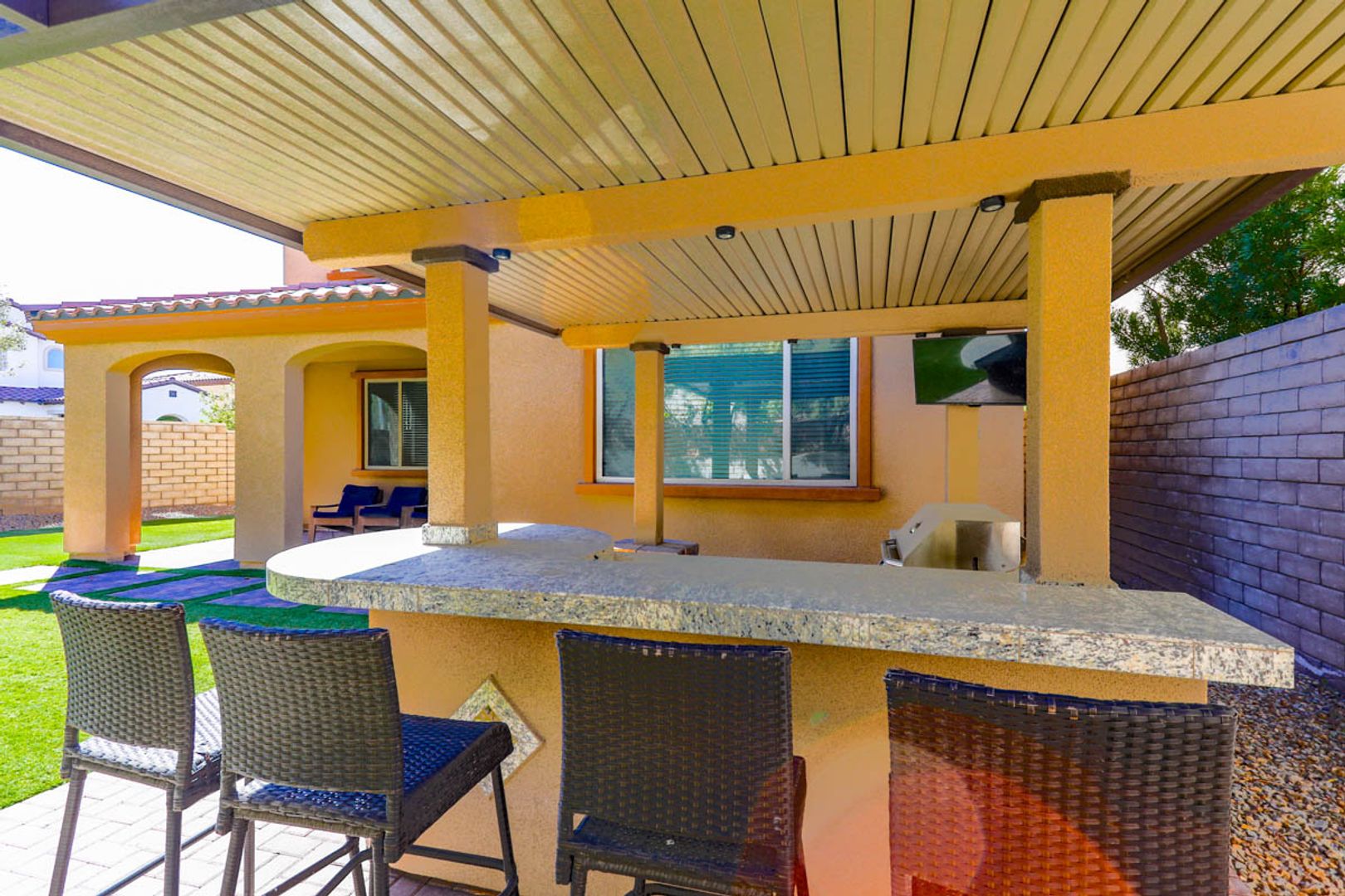 Beautiful, upgraded West Summerlin gated community home; Solar for reduced electric & EV charger in garage; Tile 1st floor w/ Luxury vinyl plank throughout the 2nd; Bright, open, w/ vaulted ceilings & 6" baseboards, gives this home a much larger feeling; 1st floor Den w/ light & a 3/4 bath; Living room w/ surround sound that seamlessly flows into the kitchen; Island kitchen w/ breakfast bar, Granite counters, abundant cabinets & storage, full wall subway tiles, walk in pantry, stainless appliances w/ double built in ovens, gas cooktop, refrigerator µowave, great for entertaining; 1st floor laundry room w/ washer & dryer; Spacious loft w/ built ins & mini fridge; Guest bedrooms w/ cable outlets & closets; Primary suite w/ cable outlet, walk in closet, double sink, soaking tub & walk in shower; Large corner lot backyard w/ covered patio, built in covered BBQ w/ refrigerator & seating, firepit & easy care syn. grass! Rent includes solar, sewer, trash and Resident Benefit Package!