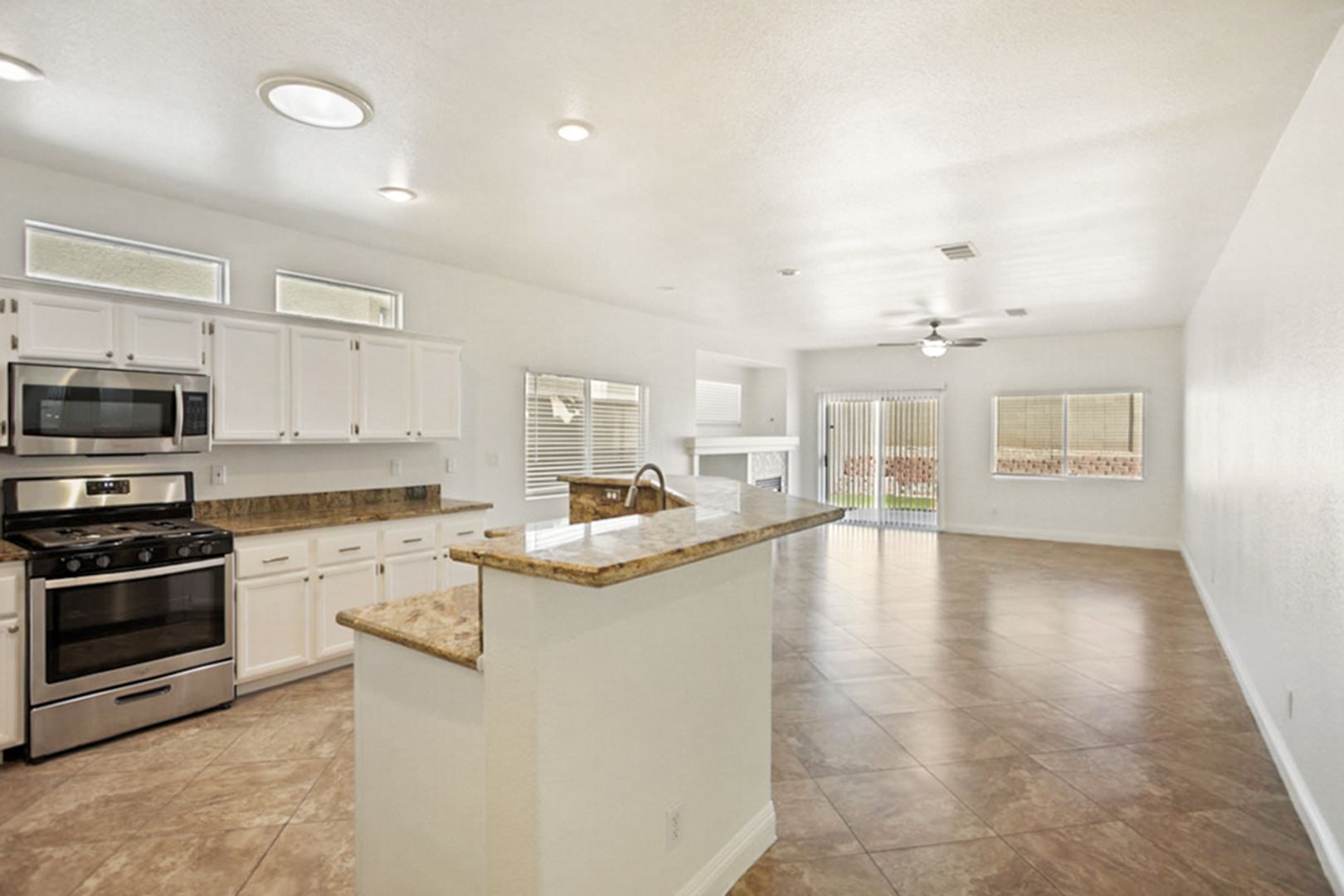 Beautiful, well kept, single story Summerlin home convenient to community center featuring parks, pools, sports fields and more; Inviting covered front porch; Tile throughout with Luxury vinyl plank flooring in guest bedrooms; Living room with light; Kitchen with Granite counters, breakfast bar, pantry, skylight to allow for natural lighting, stainless steel appliances including refrigerator and microwave; Family room with ceiling fan and light and cozy gas fireplace; Both guest bedrooms feature ceiling fans, lights and cable outlets; Full guest bath with skylight; Primary suite with ceiling fan, light, cable outlet, walk in closet, double sink, soaking tub and separate shower; 2 car garage with auto opener, entry to house, and storage cabinets; Backyard patio and synthetic grass; Convenient to schools, Aviators ball field, Downtown Summerlin, the 215, shopping, dining and much more! Rent includes sewer, trash and Resident Benefit Package!