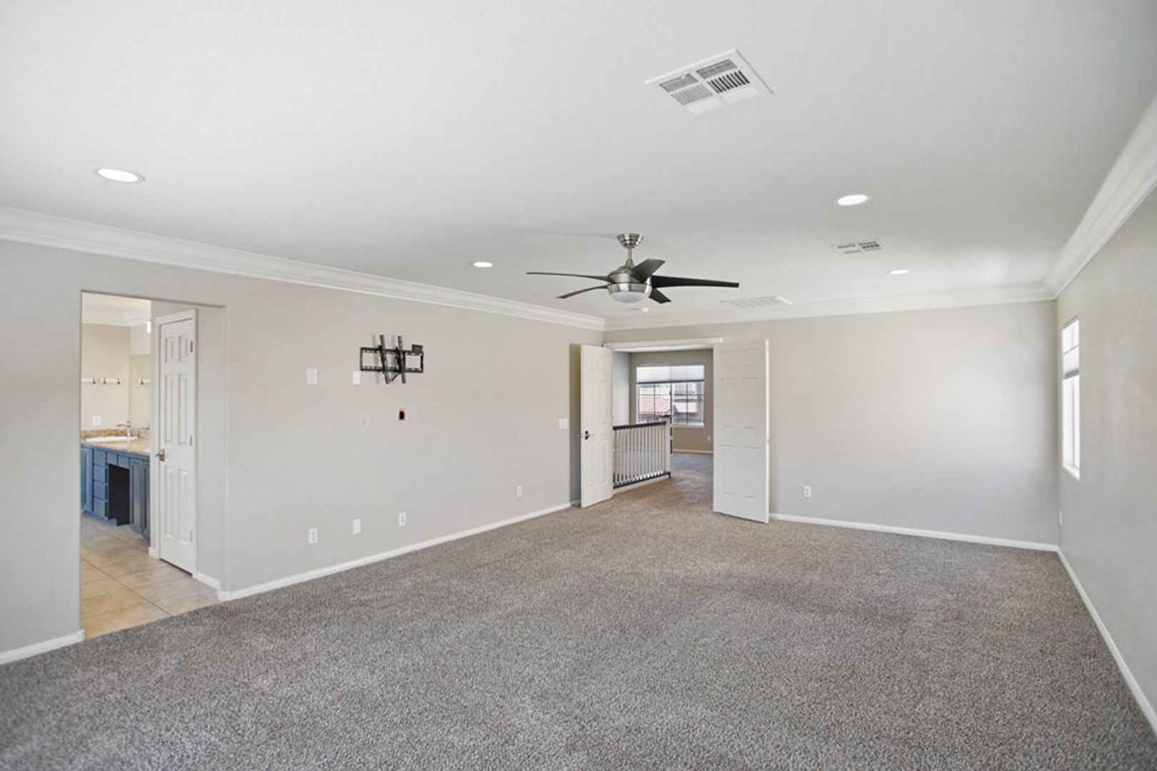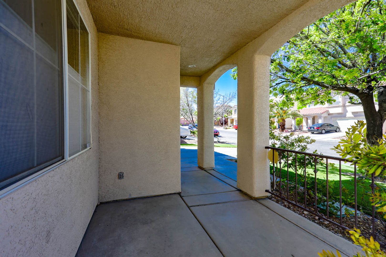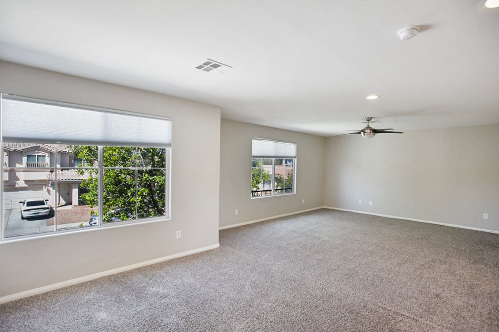 Beautiful, Southwest Vegas, pool home with first floor bed and 3/4 bath; Resort like yard with cool refreshing pool and spa, covered patio and easy care desert landscaping with syn. grass; Inviting oversized, covered, front porch leads you into a bright, open floor plan with polished solid wood floors throughout the 1st floor and carpet throughout the 2nd; Crown molding first floor and 6" baseboards add an elegant touch; Formal living and dining room; Separate family room with ceiling fan, light, TV mount and wired for surround sound; Island kitchen with Granite countertops, nook, pantry, lots of outlets for all your gadgets and stainless appliances including refrigerator and microwave; First floor bed with ceiling light, walk in closet and 3/4 bath; Huge loft, great for lots of games, walk in closet, ceiling fan and light; Guest bedrooms with lights and closets; Primary suite with ceiling fan, light, TV mount, walk in closet, double sink, make up table, deep soaking tub & separate shower; Nest thermostat, camera doorbell, Quantum Fiber, Security cameras in flood lights in front and back yard, keypad entry front door and from the house to the garage, & much more; Convenient to the 215, shopping and dining!