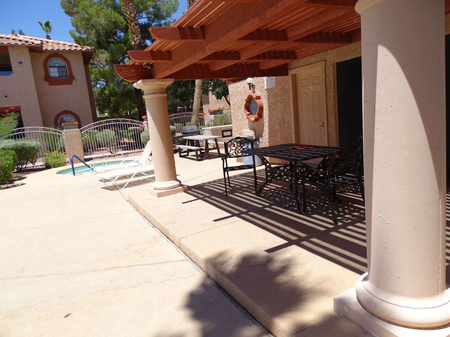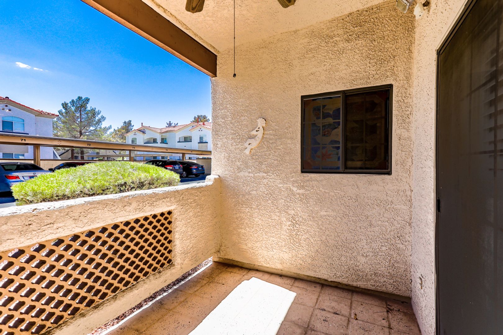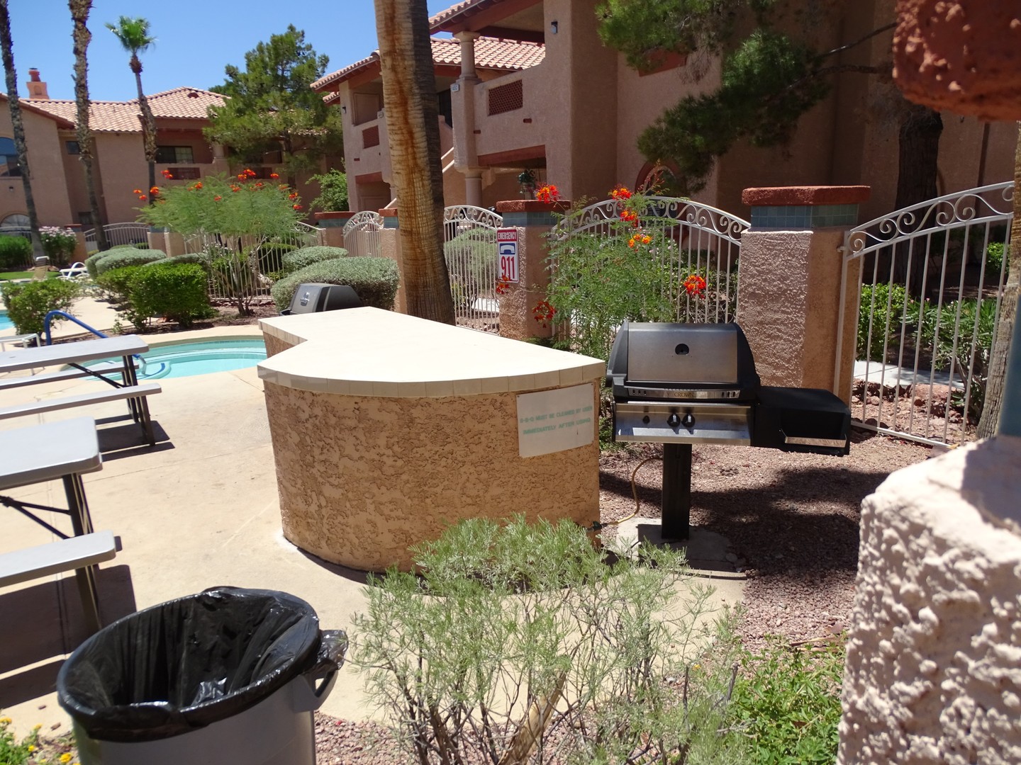 Great 1st floor condo close to CSN, shopping, restaurants & more; Patio entry w/ storage closet; M/M wood flooring throughout; Fireplace in living room & fan; Kitchen w/ Granite counter tops, pantry, built in oven, cooktop stove, microwave, refrigerator; Guest bed w/ fan, walk in closet; Primary w/ walk in closet, fan & patio; Community pool & spa, BBQ area;