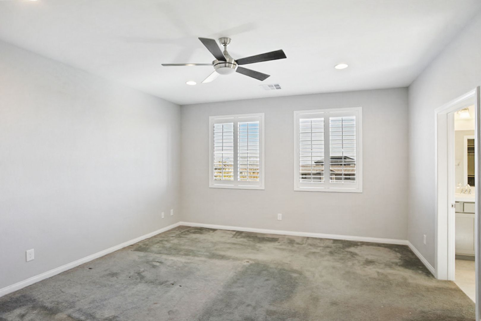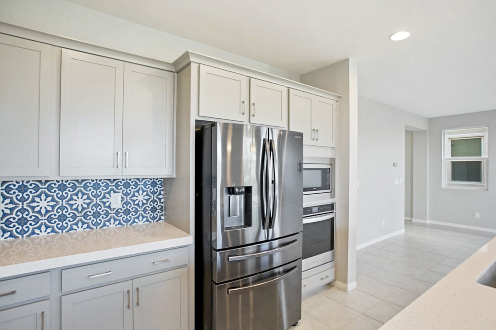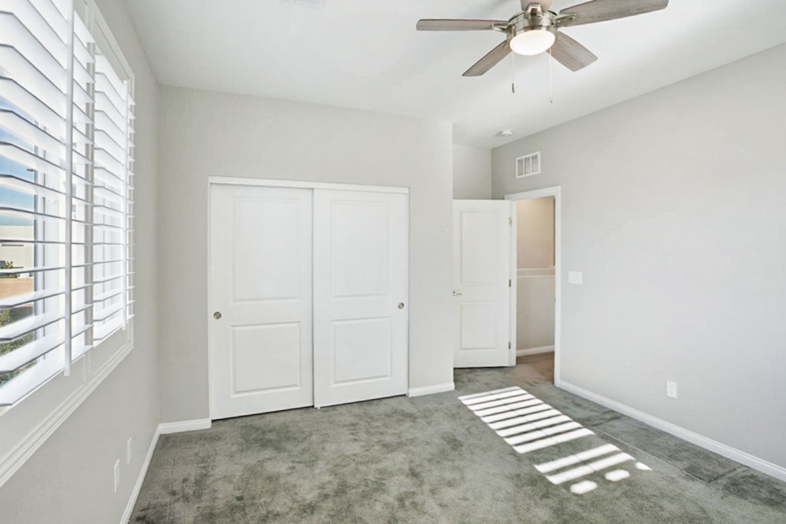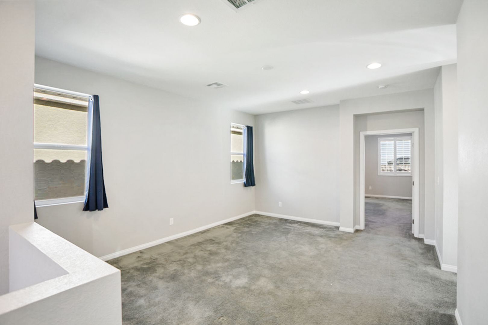 Beautiful, bright, open floor plan, cul de sack home in a gated community within the desirable Skye Canyon Community; Inviting courtyard entry with covered front porch; Easy care tile throughout the first floor, with plush carpet throughout the 2nd; Bright, open great room with recessed lighting and dining area; Island kitchen with Quartz countertops, breakfast bar with pendant lighting, stylish custom tile backsplash, walk in pantry, gas cooktop stove, built in oven, and refrigerator; Downstairs bedroom with built in draws and shelves and fold down Murphy Bed; Loft with recessed lights; Both guest bedrooms with ceiling fan, light and closets; Primary suite with ceiling fan, light, walk in closet, double sink, with large walk in closet with multiple shower heads; 2nd floor laundry room with washer, dryer and cabinets; 2 car garage with storage & water softener; Convenient location to community features, the I-11 & 215; Total Rent: $2995 ($2900 Rent + $45 RBP + $30 Sewer + $20 Trash)